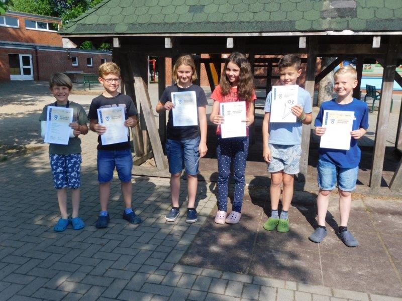 Viele Kinder des 3. und 4. Jahrganges der Grundschule Venhaus zeigten Freude an der Bearbeitung der kniffligen Aufgaben. Aus dem 3. Jahrgang qualifizierten sich 9 Kinder und aus dem 4. Jahrgang 11 Kinder für die 3. und letzte Runde, die im Mai stattfand. Die Schülerinnen und Schüler erreichten dabei alle tolle Ergebnisse. Hervorragende Leistungen zeigten Lasse B., Theresa K. und Lukas S. (2.Platz) sowie Malin L., Felix M. und Jost M. (3. Platz). Die Preisträger freuten sich über eine Urkunde und einen Geosaver.