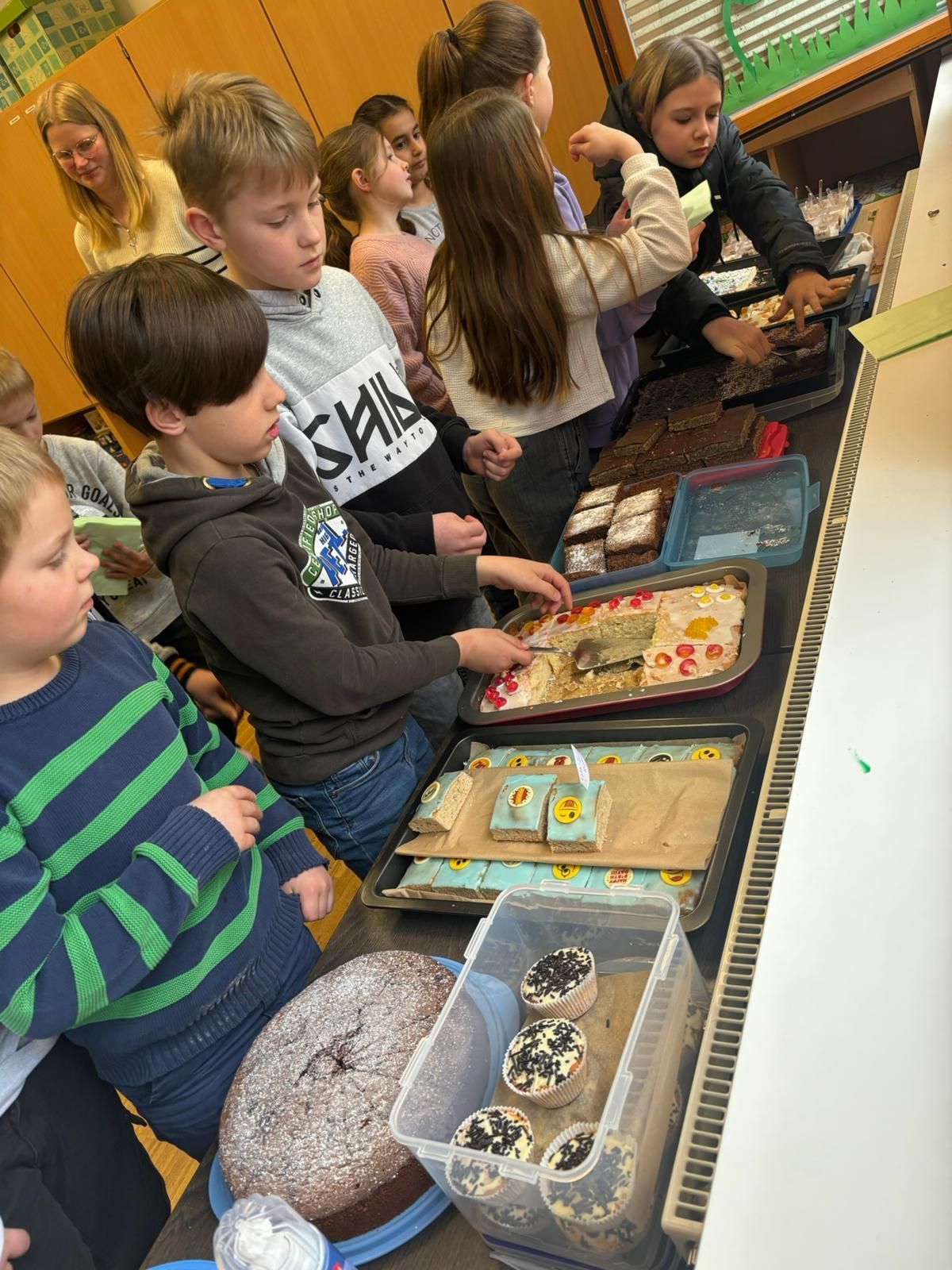 Die Schülervertretung organisierte für den 13.03. einen Kuchenverkauf. In der ersten großen Pause hatten alle Kinder die Möglichkeit für 50 Cent ein Stück Kuchen zu kaufen. Die Schlange wurde schnell lang und die Nachfrage war groß. Die Schülervertreter meisterten ihre Aufgabe sehr gut und verkauften die Kuchenstücke mit Stolz. Ein paar Stücke blieben noch übrig, sodass auch in der zweiten Pause Kuchen verkauft wurde.